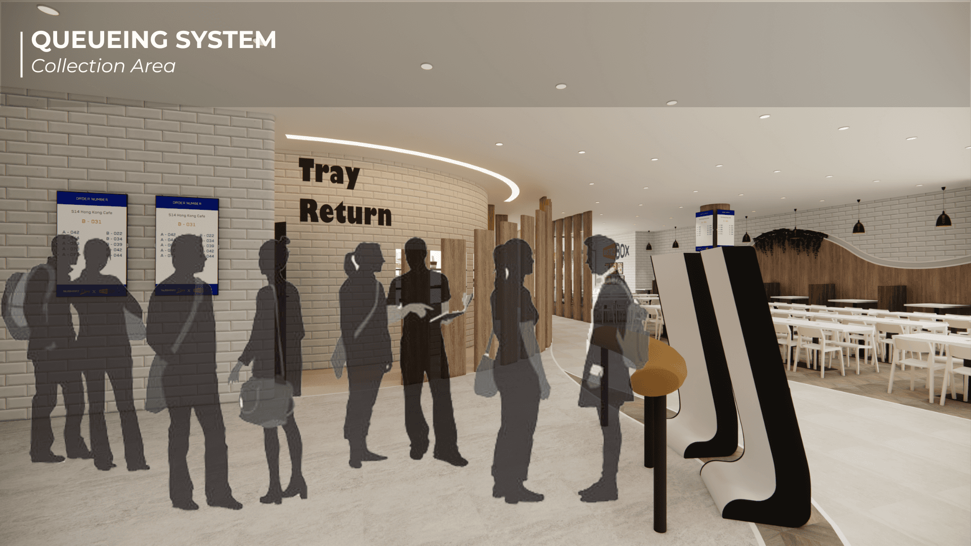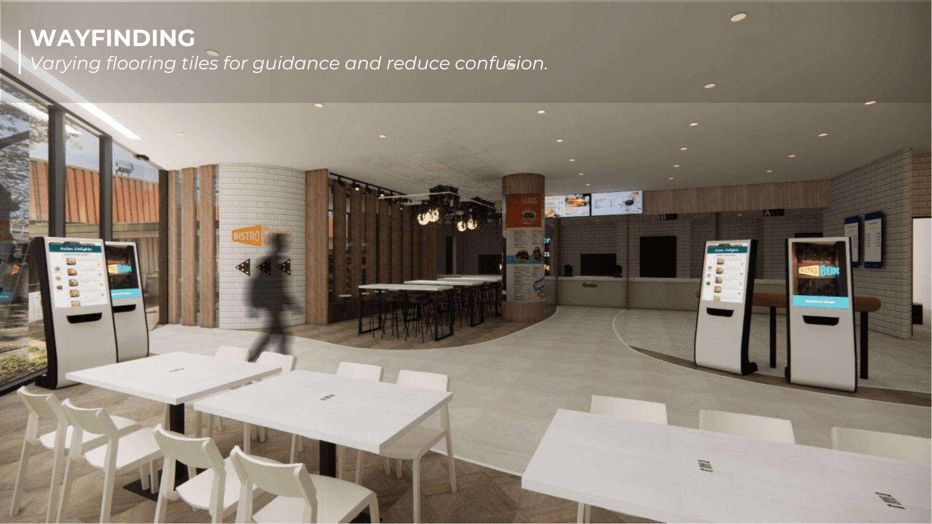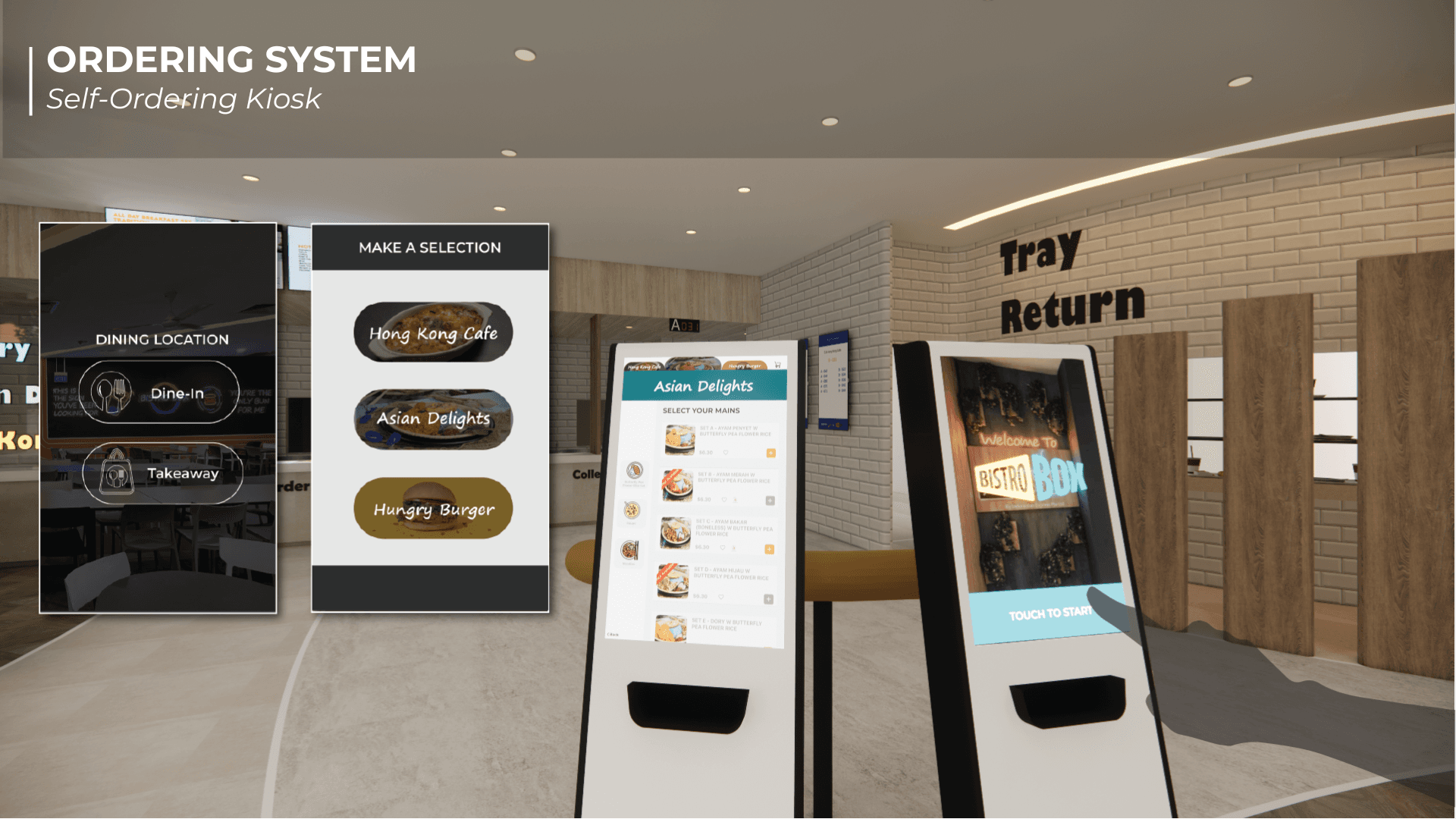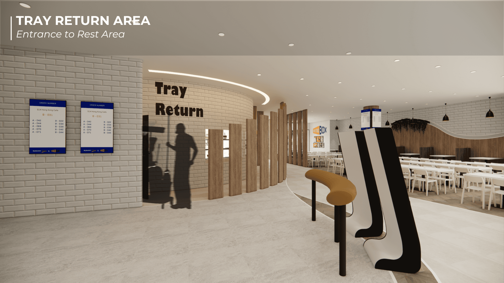 Bistro Box Reimagined began as a studio project grounded in human-centred design and the shared chaos of NUS canteens during lunch hour. We spent time observing how students squeezed through narrow walkways, how cleaners made long detours to the dishwashing area, and how stall staff often had to shout order numbers because the screens were placed in less visible areas. These small moments of stress revealed how movement, space and timing shape the dining experience, which became the foundation of our redesign. We reimagined the canteen as a smoother, more intuitive journey. Curved panels guide people through the space while also shielding diners from the mess at the tray return, creating a more pleasant eating environment. Different floor materials subtly direct foot traffic, and a single unified queue removes confusion at the counters. Ordering kiosks and QR menus ease congestion, while clearer routes reduce strain on cleaners. We also introduced Bistro Bites, a 24-hour vending and resting space that repurposes an awkward corner where SDE students often pass through, giving late-night users a quiet spot to recharge.