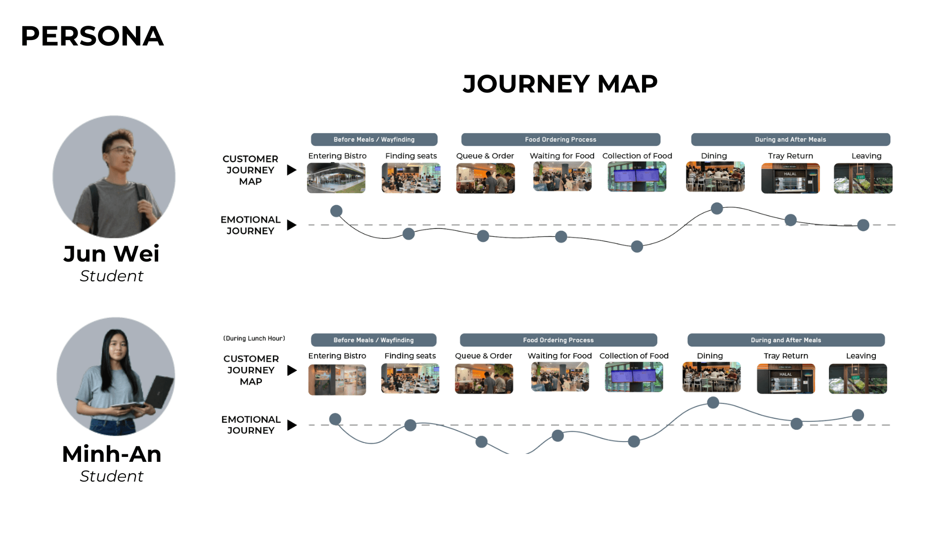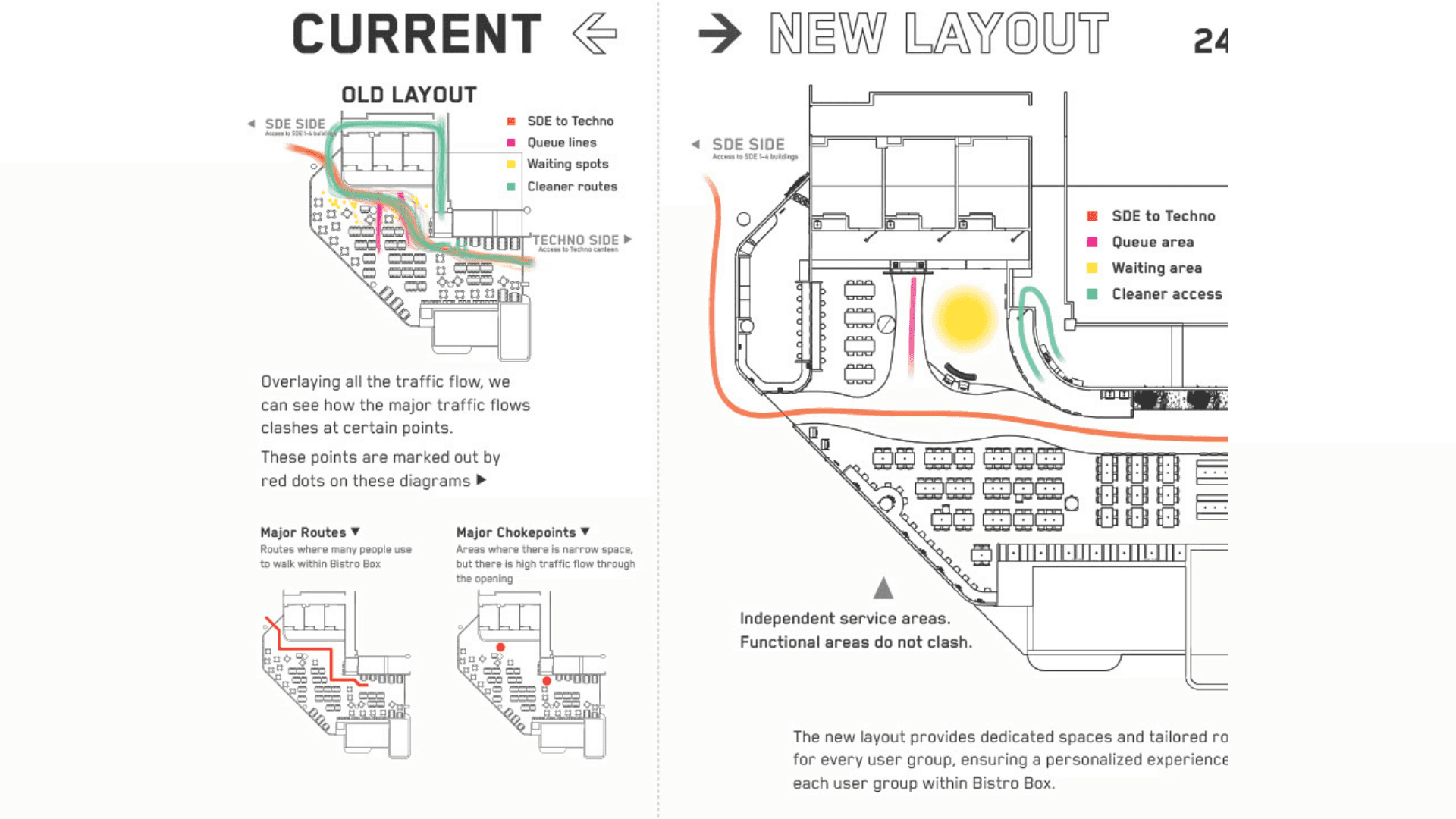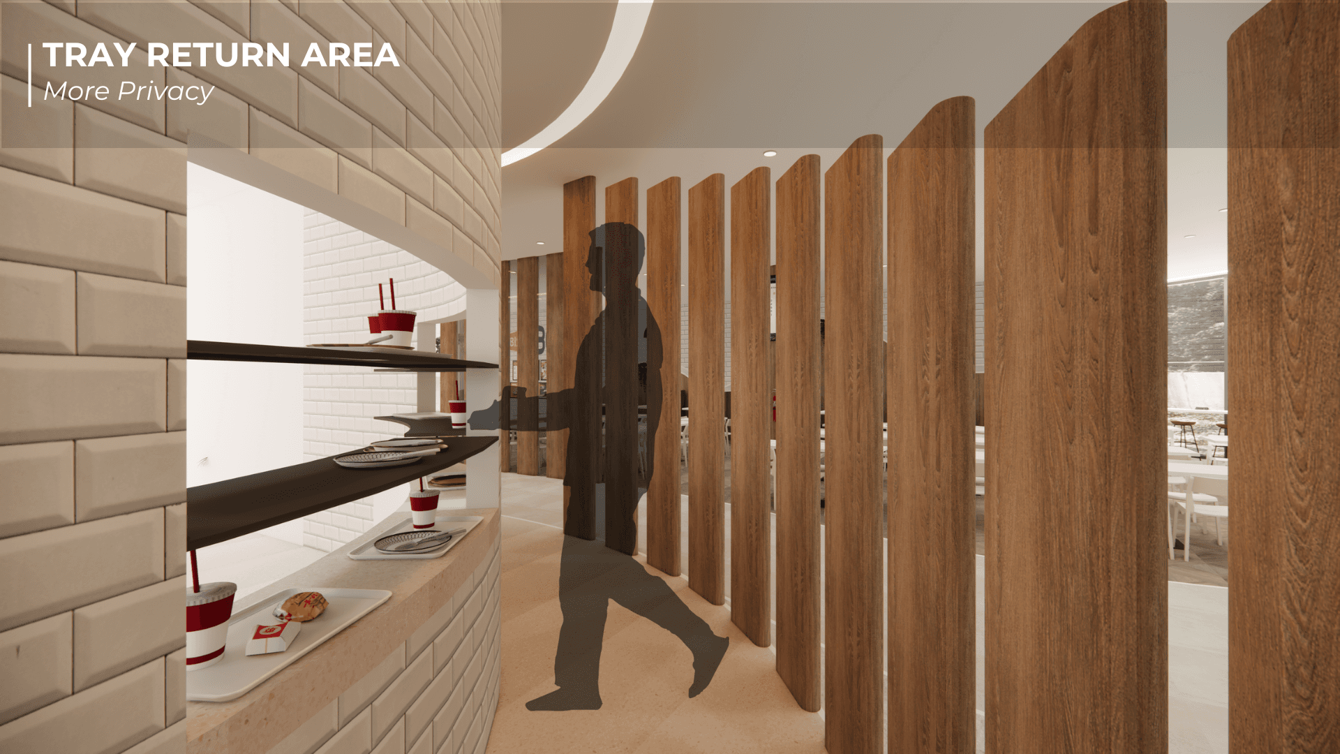Bistro Box Reimagined began as a studio project grounded in human-centred design and the shared chaos of NUS canteens during lunch hour. We spent time observing how students squeezed through narrow walkways, how cleaners made long detours to the dishwashing area, and how stall staff often had to shout order numbers because the screens were placed in less visible areas. These small moments of stress revealed how movement, space and timing shape the dining experience, which became the foundation of our redesign. We reimagined the canteen as a smoother, more intuitive journey. Curved panels guide people through the space while also shielding diners from the mess at the tray return, creating a more pleasant eating environment. Different floor materials subtly direct foot traffic, and a single unified queue removes confusion at the counters. Ordering kiosks and QR menus ease congestion, while clearer routes reduce strain on cleaners. We also introduced Bistro Bites, a 24-hour vending and resting space that repurposes an awkward corner where SDE students often pass through, giving late-night users a quiet spot to recharge.