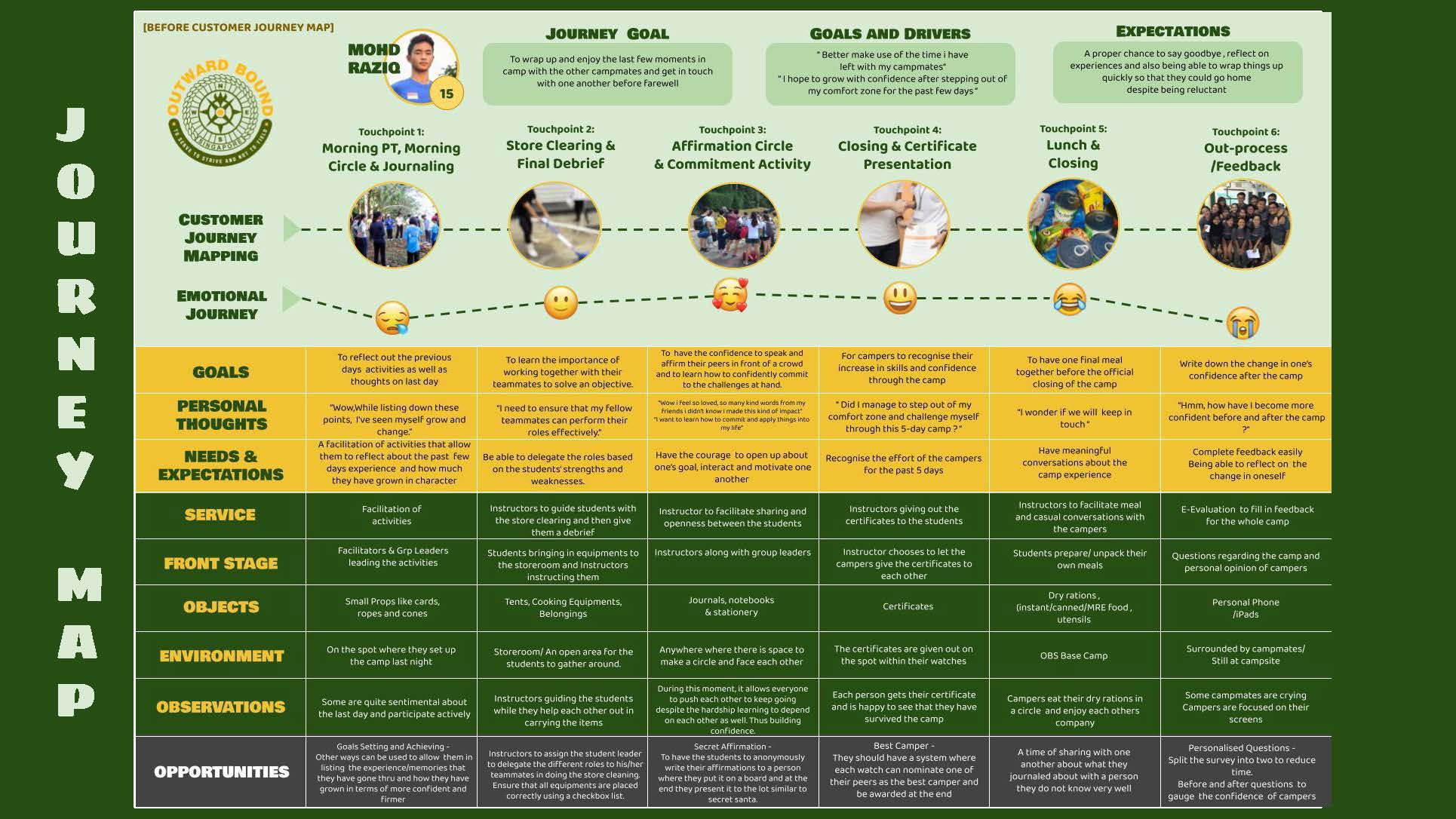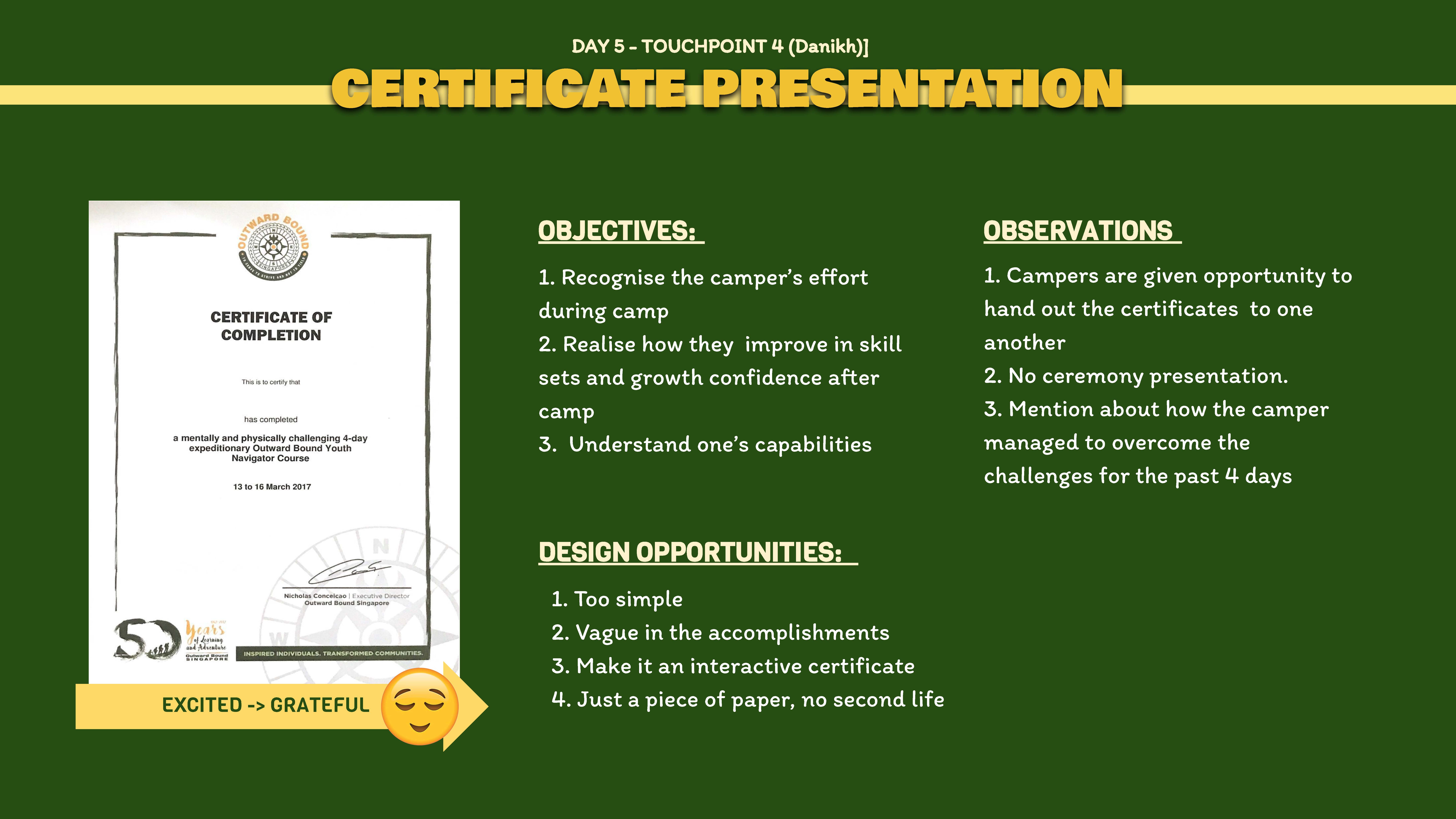 MERIT BADGES RETHINKS HOW OUTWARD BOUND SINGAPORE RECOGNISES GROWTH, RESILIENCE AND CHARACTER BEYOND THE CONFINES OF A CERTIFICATE. INSPIRED BY THE EMOTIONAL UPS AND DOWNS PARTICIPANTS EXPERIENCE THROUGHOUT THE CAMP, THE PROJECT EXPLORES HOW THESE FLEETING MOMENTS CAN BE CAPTURED AND CELEBRATED IN A WAY THAT FEELS PERSONAL AND LASTING. THROUGH RESEARCH AND CONVERSATIONS, WE SAW HOW MANY STRUGGLED TO RECALL THEIR OWN TURNING POINTS ONCE THEY RETURNED TO EVERYDAY LIFE, AND HOW THE EXISTING CERTIFICATE SYSTEM DIDN’T REFLECT THE REAL, MESSY, HUMAN JOURNEY THEY WENT THROUGH. THIS OPENED UP A SPACE TO EXPLORE HOW SMALL ACTS OF EXTRINSIC MOTIVATION COULD GENTLY SUPPORT REFLECTION AND CONFIDENCE-BUILDING. THE REDESIGNED EXPERIENCE TREATS THE OBS JOURNEY AS A SERIES OF MEANINGFUL TOUCHPOINTS RATHER THAN A CHECKLIST. MERIT BADGES BECOMES A WAY FOR PARTICIPANTS TO EARN SYMBOLS TIED TO REAL CHALLENGES AND REFLECTIONS, SUPPORTED BY A SIMPLE DIGITAL LAYER THAT HELPS THEM TRACE THE EMOTIONAL AND PHYSICAL PATH THEY TOOK. THE INTENTION WAS TO CREATE SOMETHING THAT FEELS MEMORABLE AND HONEST TO THE EXPERIENCE ITSELF, ALLOWING PARTICIPANTS TO RECOGNISE THEIR OWN GROWTH LONG AFTER THE ADVENTURE HAS ENDED. THIS PROJECT REFLECTS MY CONTRIBUTION TO THE EXPERIENCE, BRANDING AND VISUAL STORYTELLING, WITH THE FULL SERVICE FLOW AVAILABLE ON BEHANCE.